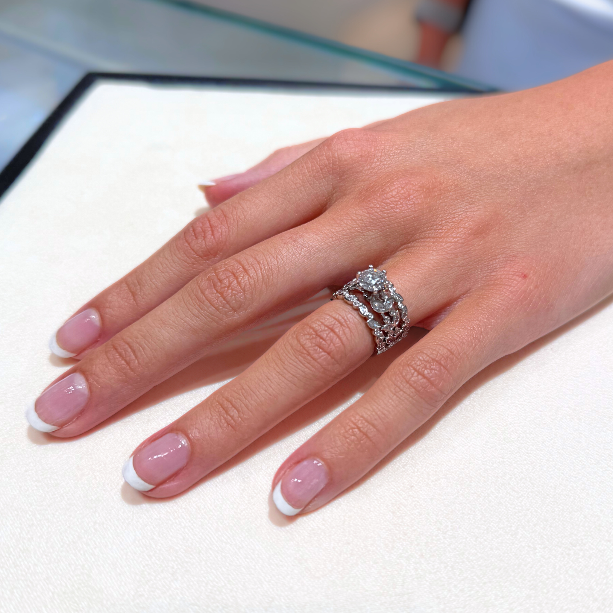 Adelle chose an exquisite floral-inspired design that reflects her refined taste and love for intricate craftsmanship. Her engagement ring and coordinating wedding bands were created with meticulous attention to detail, with every element carefully considered to bring her vision to life.