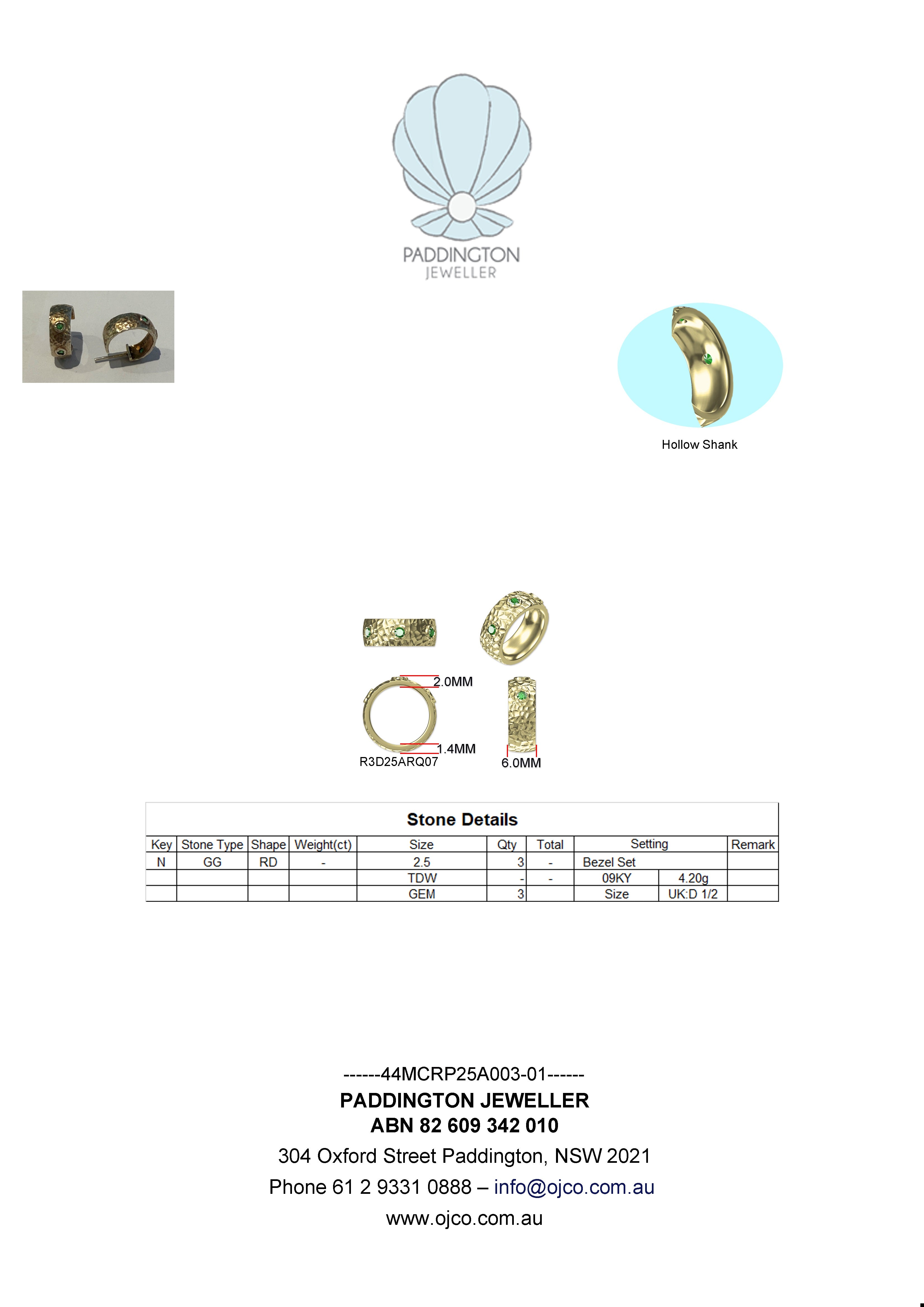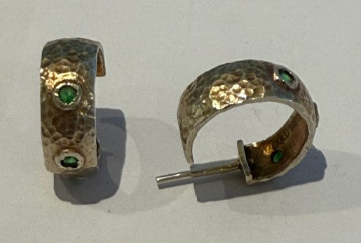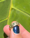 Nigdali happened to put one of her earrings on her finger and decided that it was a better ring than an earring, so she asked us to recreate these earrings as rings. We matched the colour with green garnet and set them in 9kt yellow gold