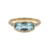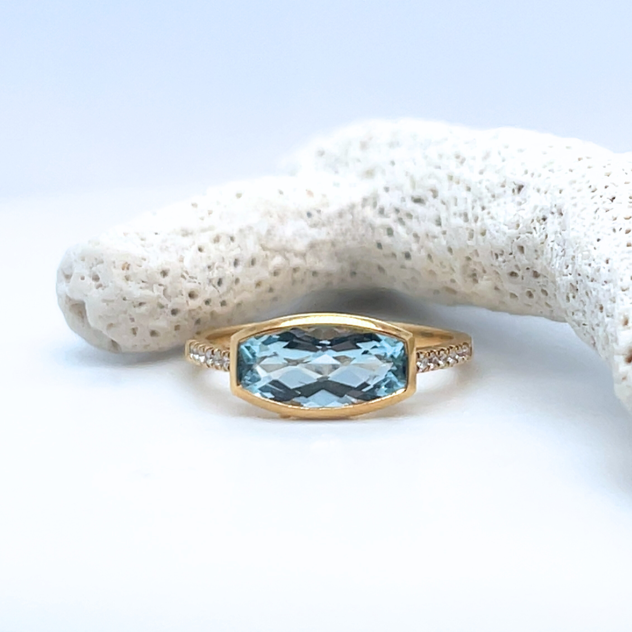 1.90ct elongated cushion-cut blue topaz with 0.09ct diamond accents in 18kt yellow gold — luminous, feminine, and elegantly refined.