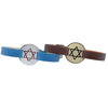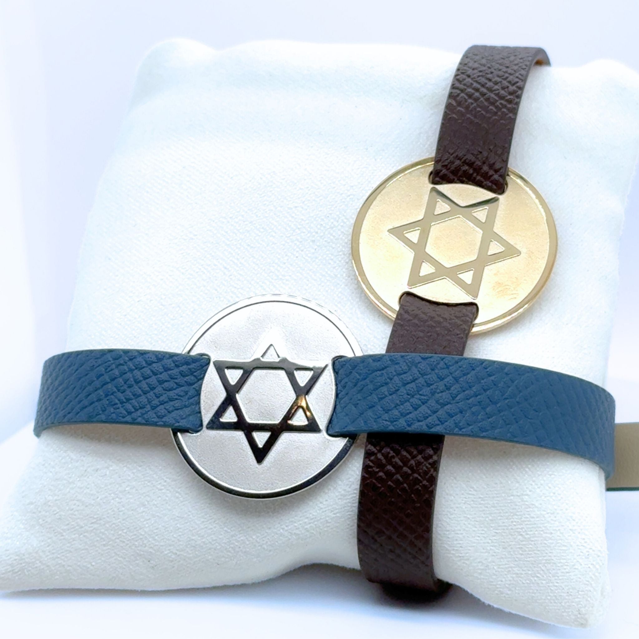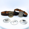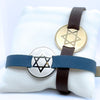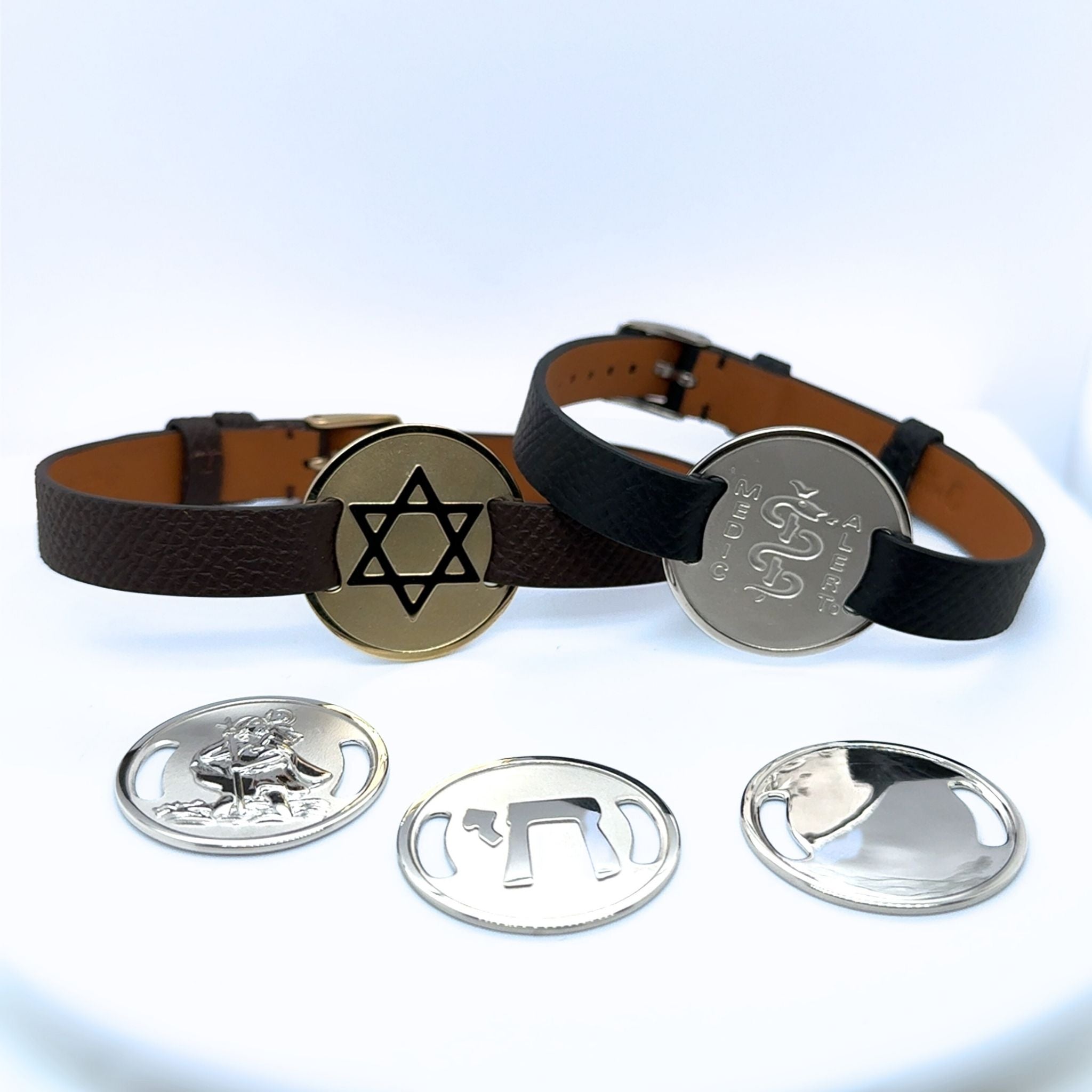 The collection features a curated selection of interchangeable plaques crafted in sterling silver or 9kt yellow gold, paired with leather straps available in a range of colours. Designs include meaningful symbols such as the Star of David, Chai, Saint Christopher, and Medical Alert plaques, alongside minimalist blank plaques that can be engraved with names, dates, symbols, blood type, allergies, or personal messages.
