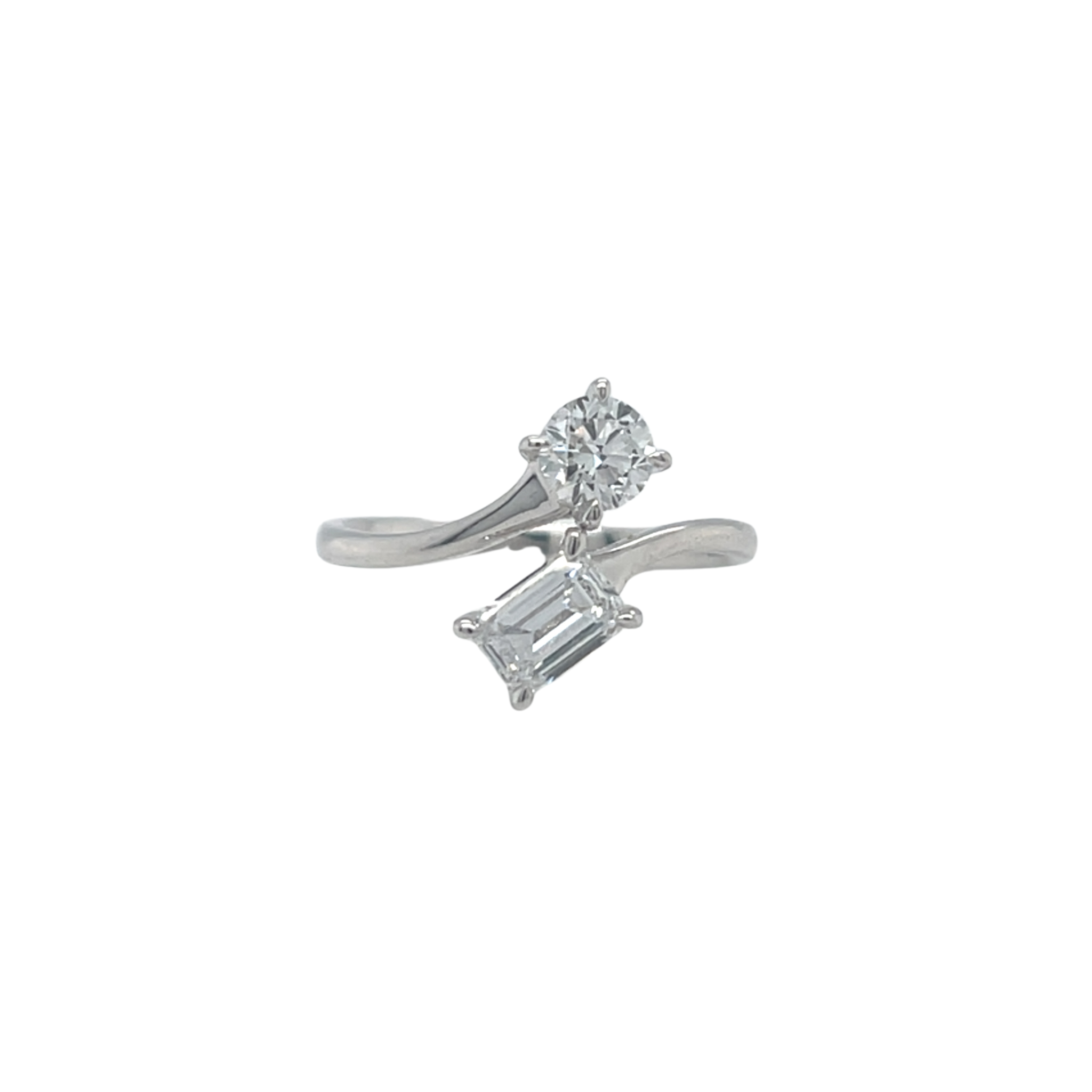 Ideal as a gift for a cherished partner, daughter, or lifelong friend, this symbol of unity, love, and harmony is embodied in a harmonious design. Featuring a total of 1.03 carats of lab-grown diamonds, the ring pairs an emerald cut with a round brilliant cut to create a striking contrast. Crafted in exquisite 14kt white gold, its graceful curves and dual-tone setting offer an enduring expression of elegance and commitment.
