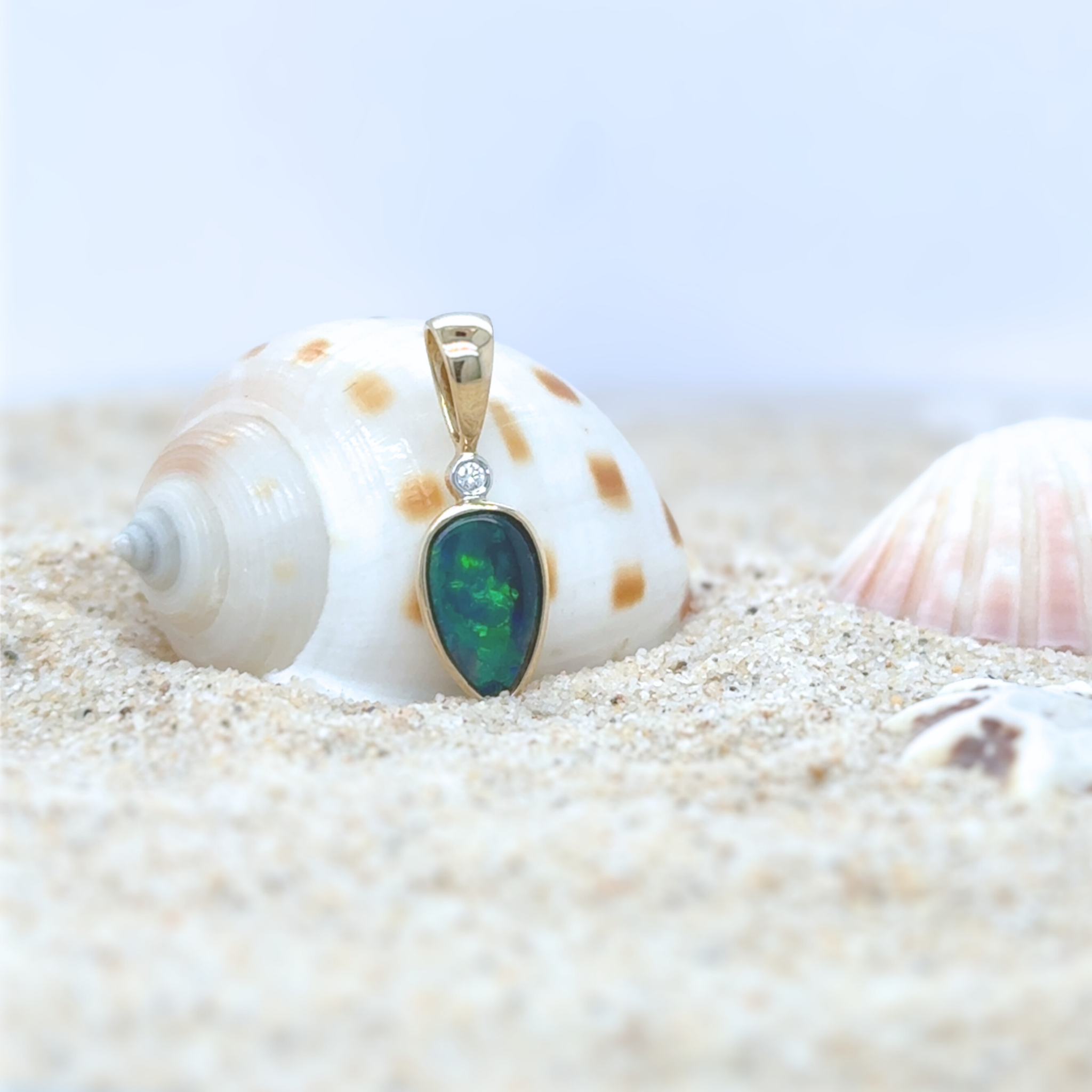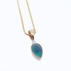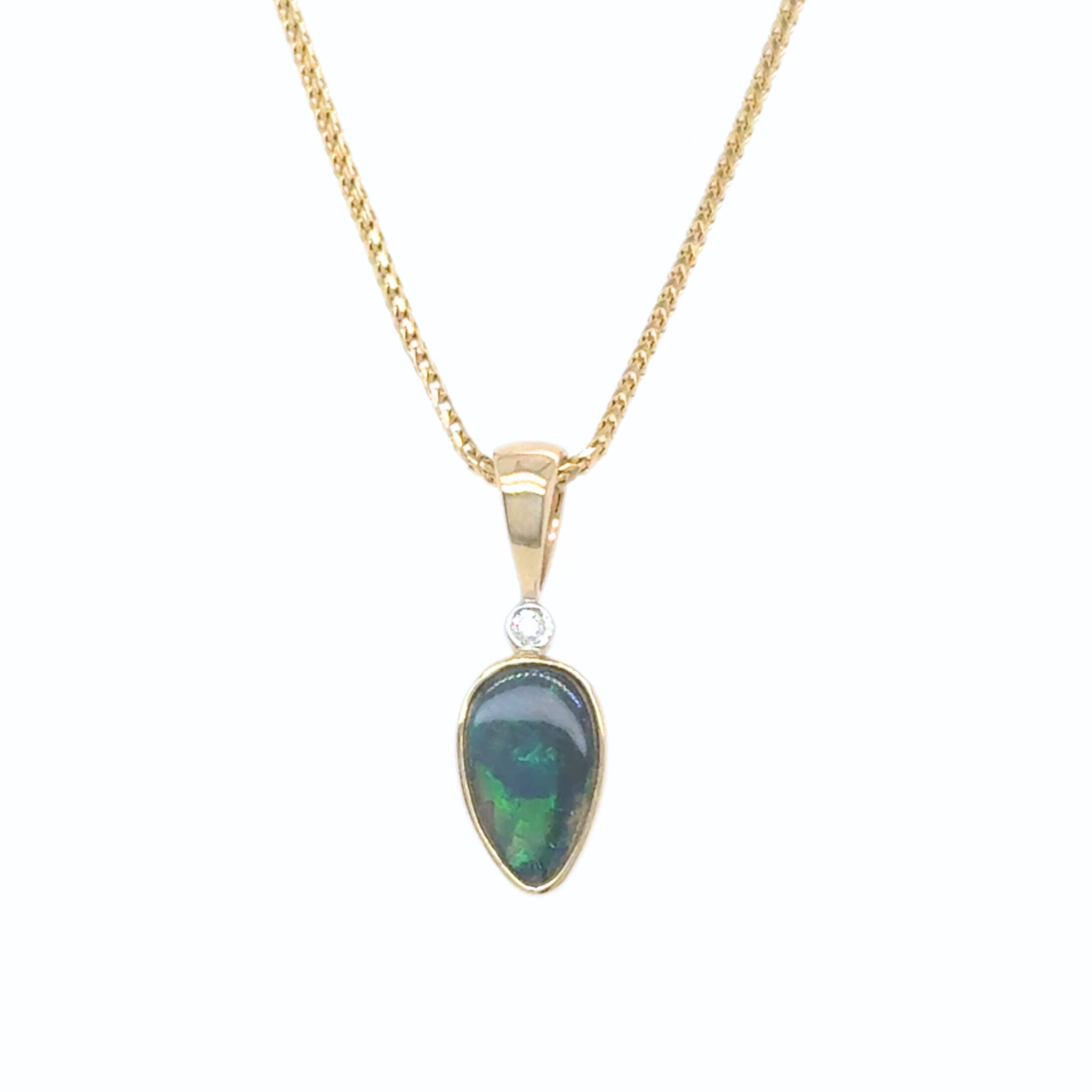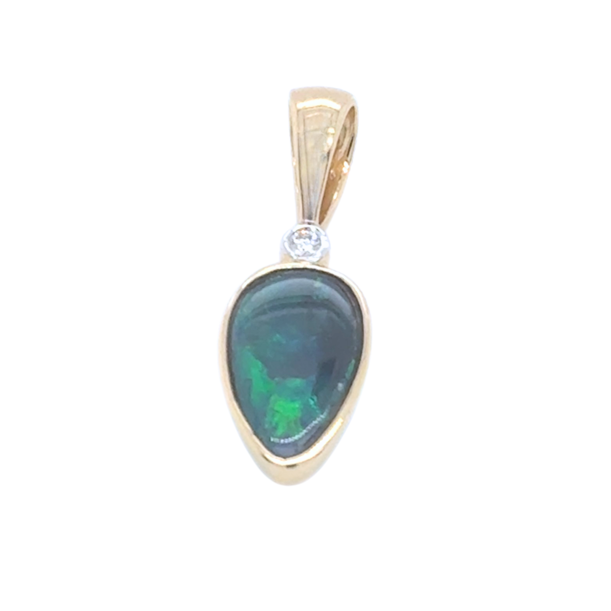 Set in 14kt yellow gold the freeshape Australian black opal 1.33ct is stunning blue and green block  pattern, highlighted by a 0.02ct round brilliant cut diamond with a modern bezel setting compliments the frreeshape shape of the opal this pendant does not include a chain