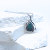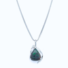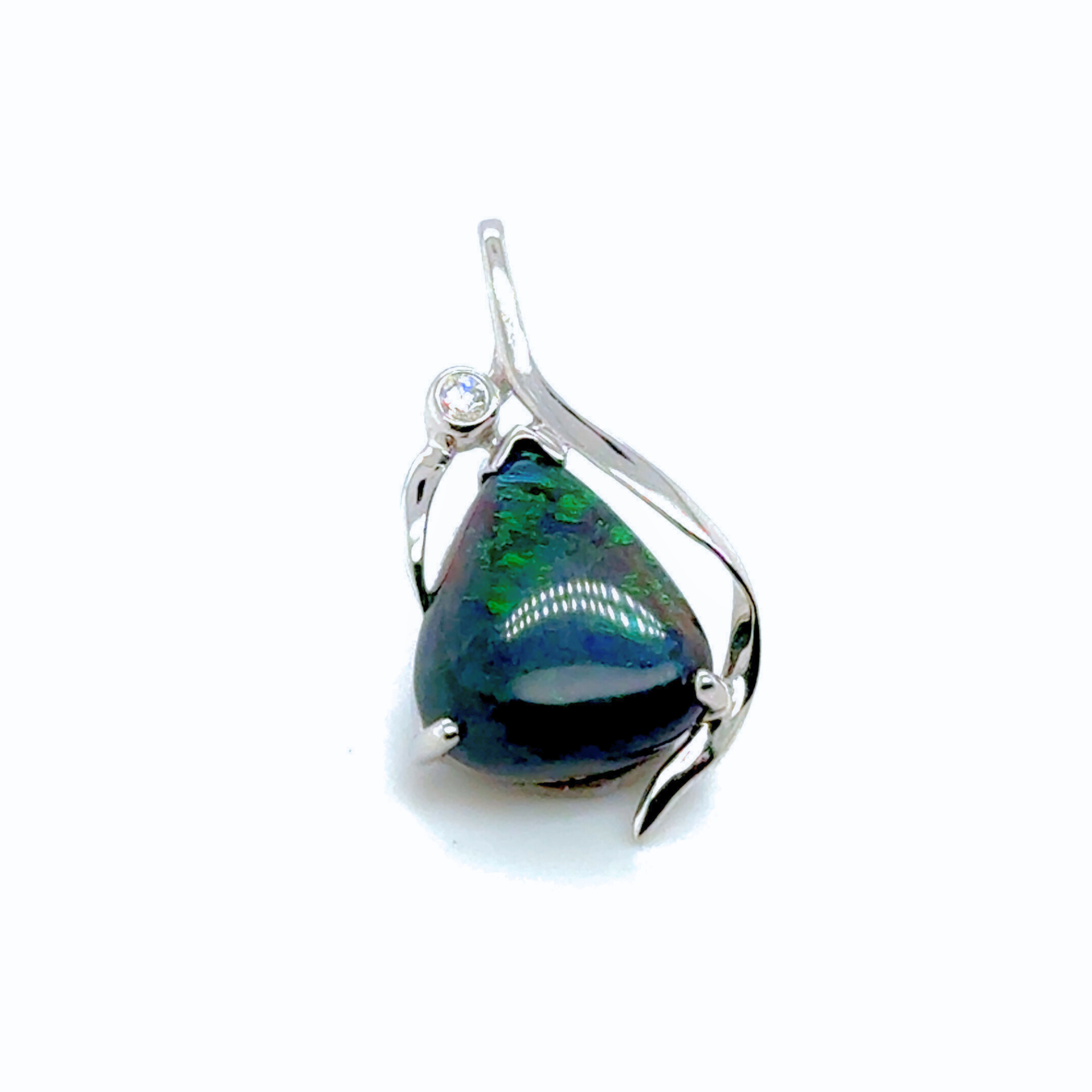 Set in 14kt white gold the freeshape Australian black opal 2.91ct is stunning blue and green pinfire  pattern, highlighted by a 0.03ct round brilliant cut diamond with an vine like design  setting compliments the freeshape shape of the opal this pendant does not include a chain