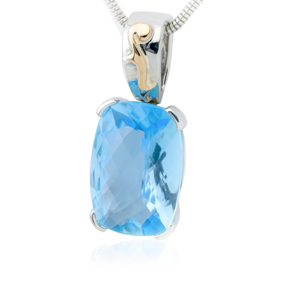This intricate handcrafted design showcases a sparkling 12.00ct oval cut blue topaz. Set with sterling silver and 9kt rose gold, an affordable addition to any collection.
