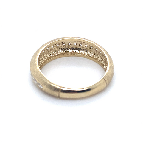 Experience pure elegance with our exquisite 14kt gold dress ring. It's chic crazed matte finish and delicate row of round brilliant cut diamonds (0.39ct total weight) running across the perfect...