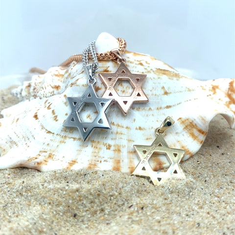 Plain big Star Of David pendant in 14kt or 18kt yellow, white or rose gold. The start is 16mm and 1.8mm wide. It has an inscription on the front and the...