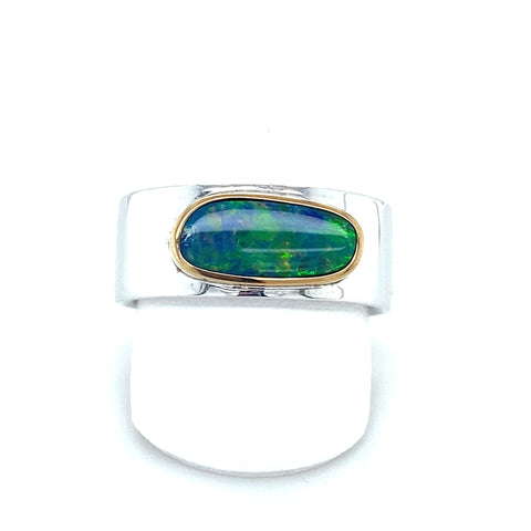 Handmade 9kt white and yellow gold unisex ring with a stunning Australian Doublet Opal.