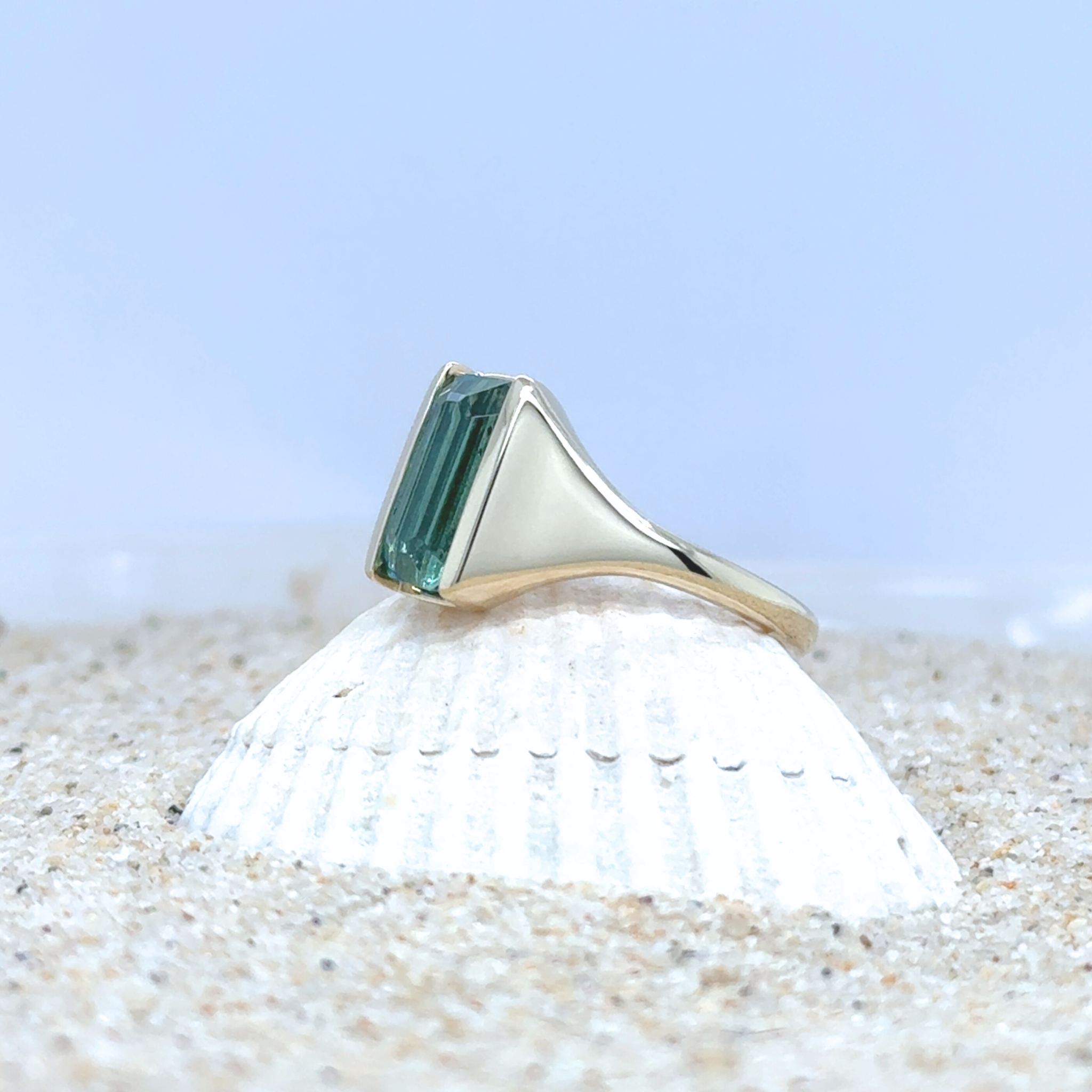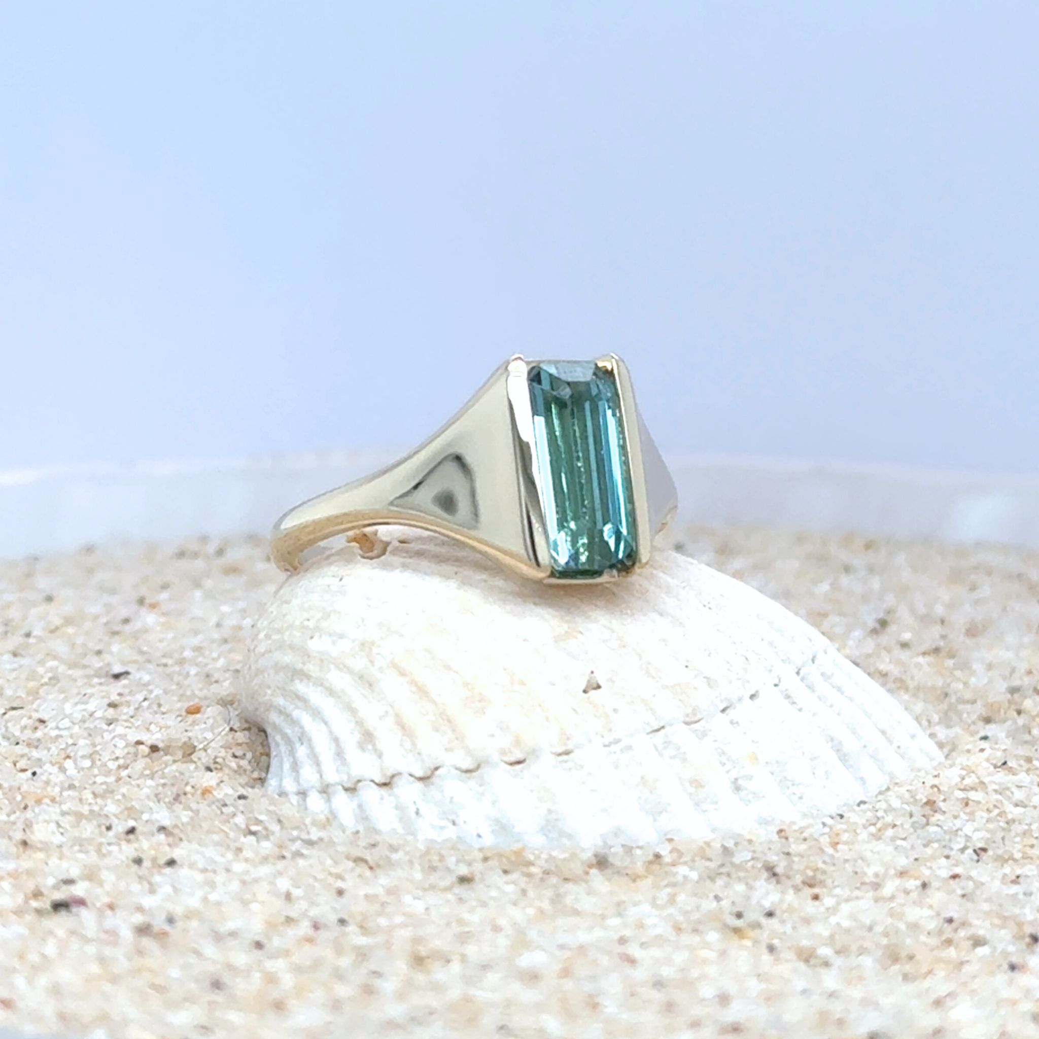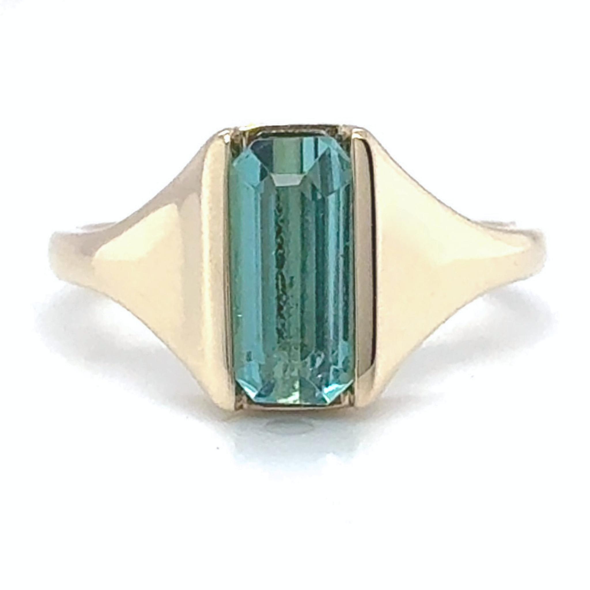 Tourmalines are known for their remarkable range of colors, but green varieties—especially in this vivid forest-to-jungle tone—are particularly coveted. The elongated silhouette of this gemstone lends itself beautifully to contemporary design, offering a balance of elegance and modern restraint. Finished with a high-polish yellow gold band, the Luciana Ring is a refined expression of natural beauty and thoughtful craftsmanship.