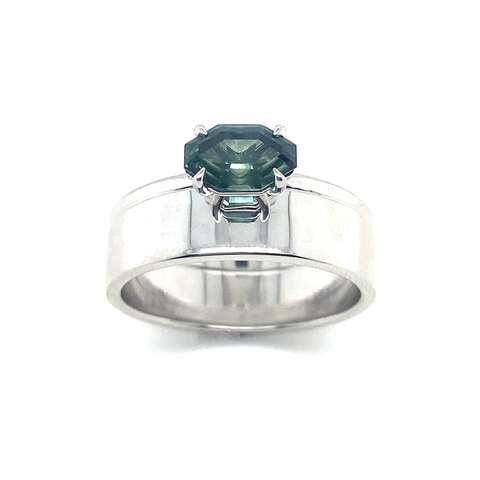 "Mid Century Modern" inspired design with an unique octagon cut Australian Parti Colour Sapphire. It is stackable with any straight band. Sapphire: Carat Weight=1.53ct, Cut: Octagon cut, Colour=Parti colour( Green/Blue ) Metal: 14KWG(...