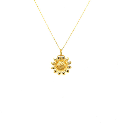 Beautiful sun flower pendant made in 9kt yellow gold with a fine chain. As the sun flowers look for the sun and move around his light make this necklace remember you...